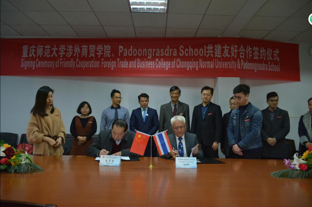 2018年3月19日下午14点,在我校行政楼三楼会议室举行了重庆师范大学涉外商贸学院和泰王国彭世洛府帕东拉学校、泰王国盛唐文化教育集团合作交流签约仪式。出席签约仪式的有重庆师范大学涉外商贸学院常务副校长王乃武,帕东拉学校校长王石辉,盛唐教育集团董事长唐小冬,文学与新闻学院院长林健、副院长何杨波、缪佳芹。