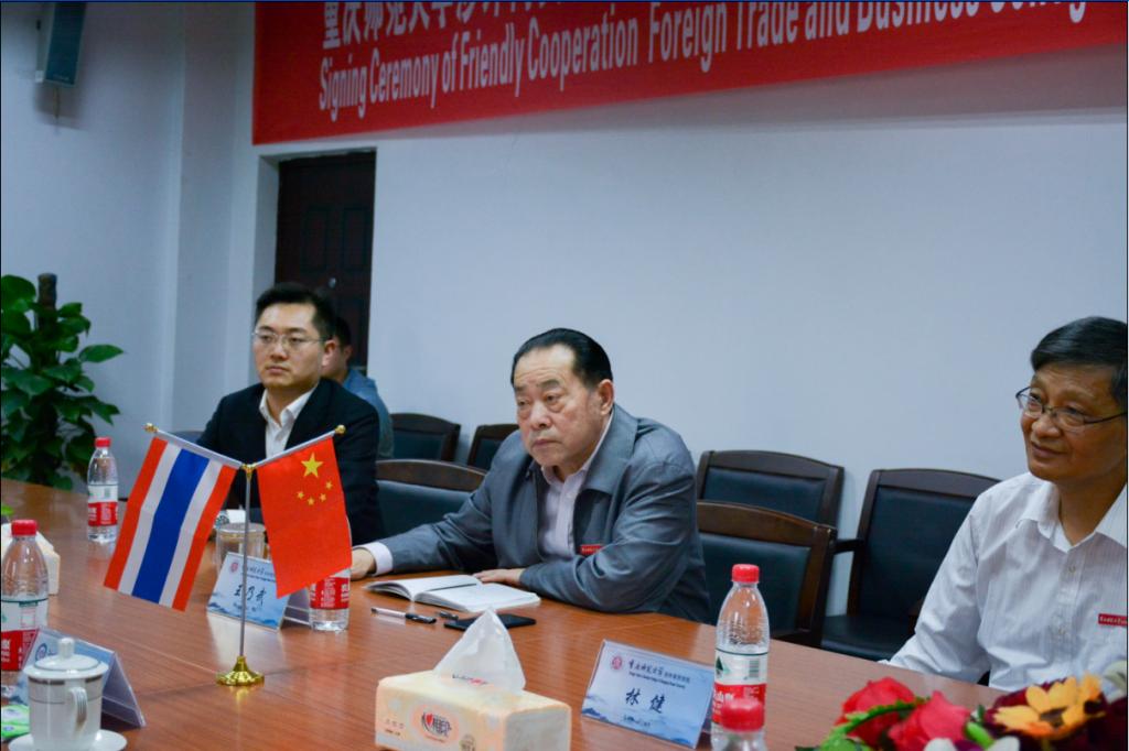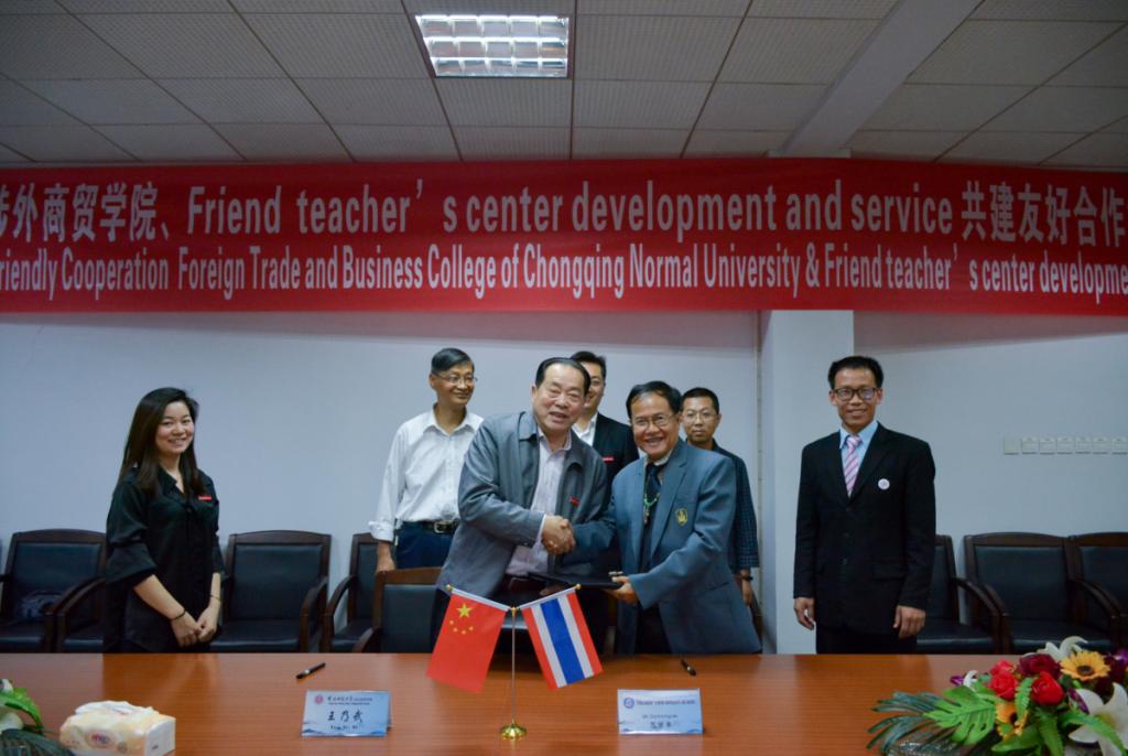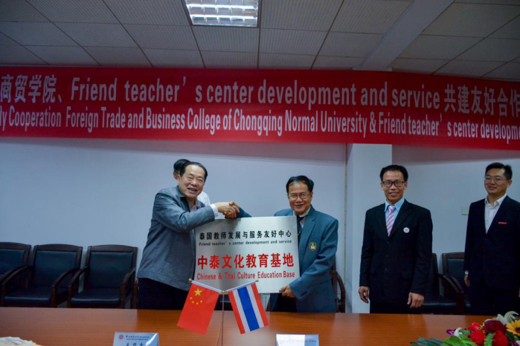 (记者:胡家宝 唐子涵)4月10日下午5时许,在我校行政楼三楼会议室内举行了重庆师范大学涉外商贸学院与泰国教师发展与服务友好中心的合作签约仪式。出席签约仪式的有泰国教师发展服务友好中心总负责人苏健康,重庆师范大学涉外商贸学院常务副校长王乃武,以及我校文学与新闻学院院长林建、副院长何杨波等。该项目旨在更好的传播中华文化,并为我校学子提供一个国际化的实习教学平台。