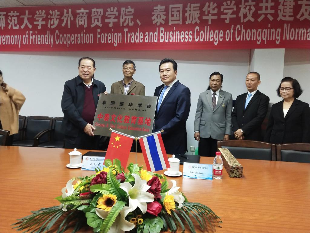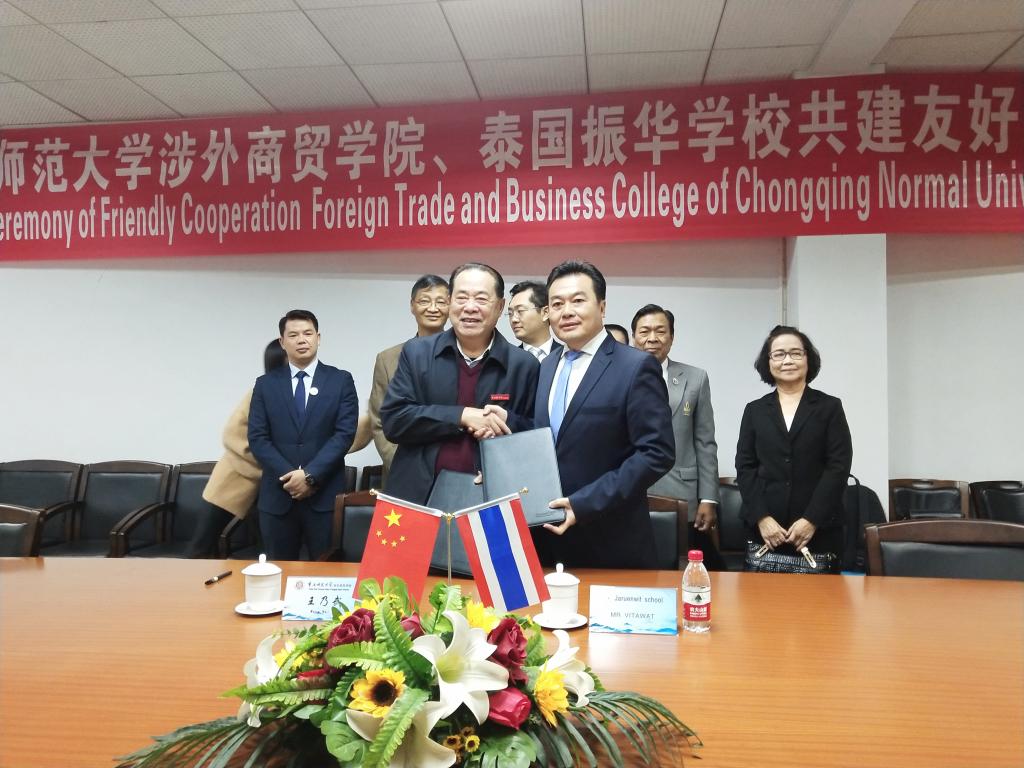 2018年10月22日10:45,重庆师范大学涉外商贸学院与泰国振华学校在行政楼三楼会议室举行签约仪式。