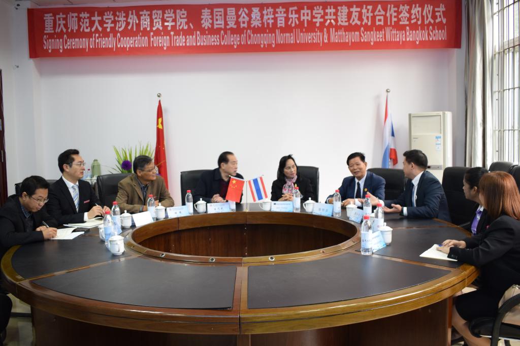 2018 年10月24日10:00,重庆师范大学涉外商贸学院与泰国桑梓音乐中学在国际学院G105举行签约仪式。出席本次会议的有:重庆师范大学涉外商贸学院常务副校长王乃武,泰国桑梓音乐中学校长Mrs.PRANEE、教务长Mrs.CHOLTICHA、老师Ms.MASSARIN,盛唐文化教育集团董事长唐小冬、泰语顾问徐创业,国际交流处处长刘用,文学与新闻学院院长林健、副院长王杨丽、党总支书记何杨波、辅导员林燕。