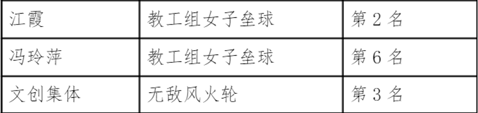 在下午的决赛竞争中,江霞老师荣获教工组女子垒球比赛第二名,余英俊同学在男子引体向上甲组取得第4名佳绩,同时,赖雨馨同学在甲组女子铅球中取得第3名的好成绩。