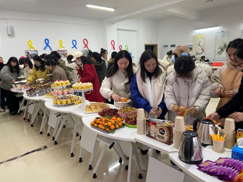 活动开始前,考研学子们陆续到达教室,通过自助取餐的方式享用着我院在此次活动中为同学们准备的甜皮鸭、柠檬凤爪、寿司等冷食,纸杯蛋糕、切方蛋糕等甜点,红提、甜橘等水果,以及各种口味的奶茶、咖啡等热饮。