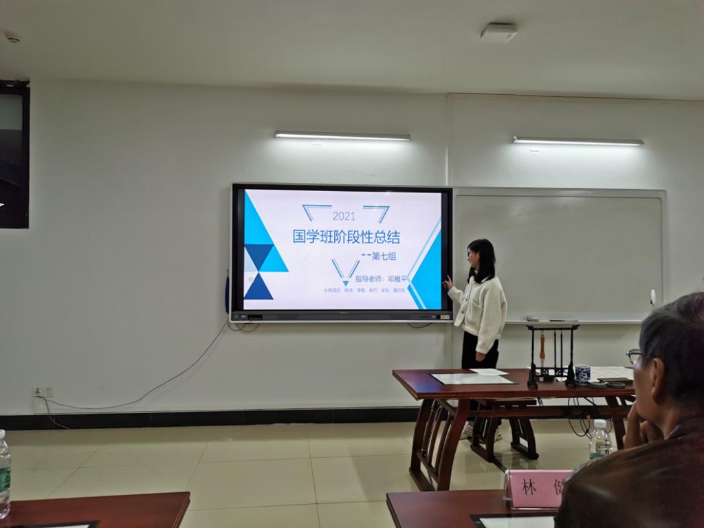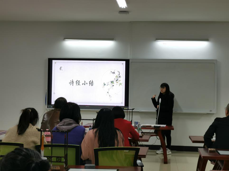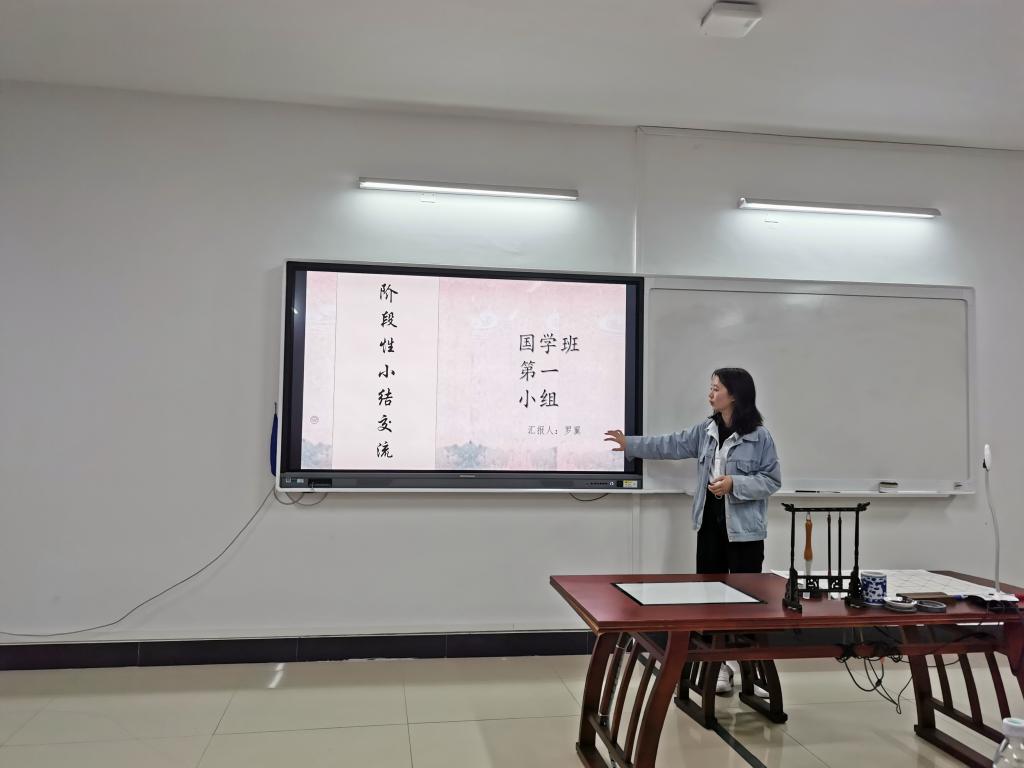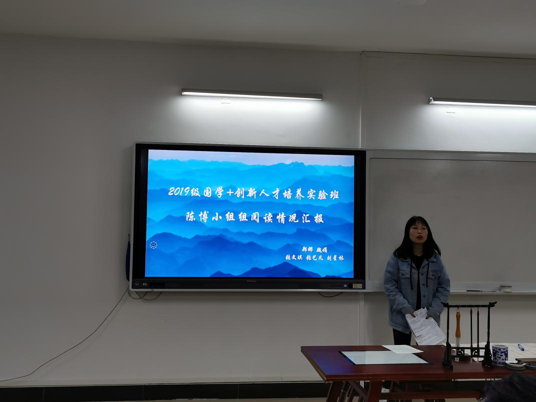 会议伊始,吴鹏老师介绍了国学班在过去几个月的整体学习情况以及本次大会的目的,并简述了本学期对学生们的展望。老师们入座后,由陈秀琴副教授讲话,鼓励这次大会学生们畅所欲言,至此大会开始,各小组成员代表依次上台进行汇报演讲。