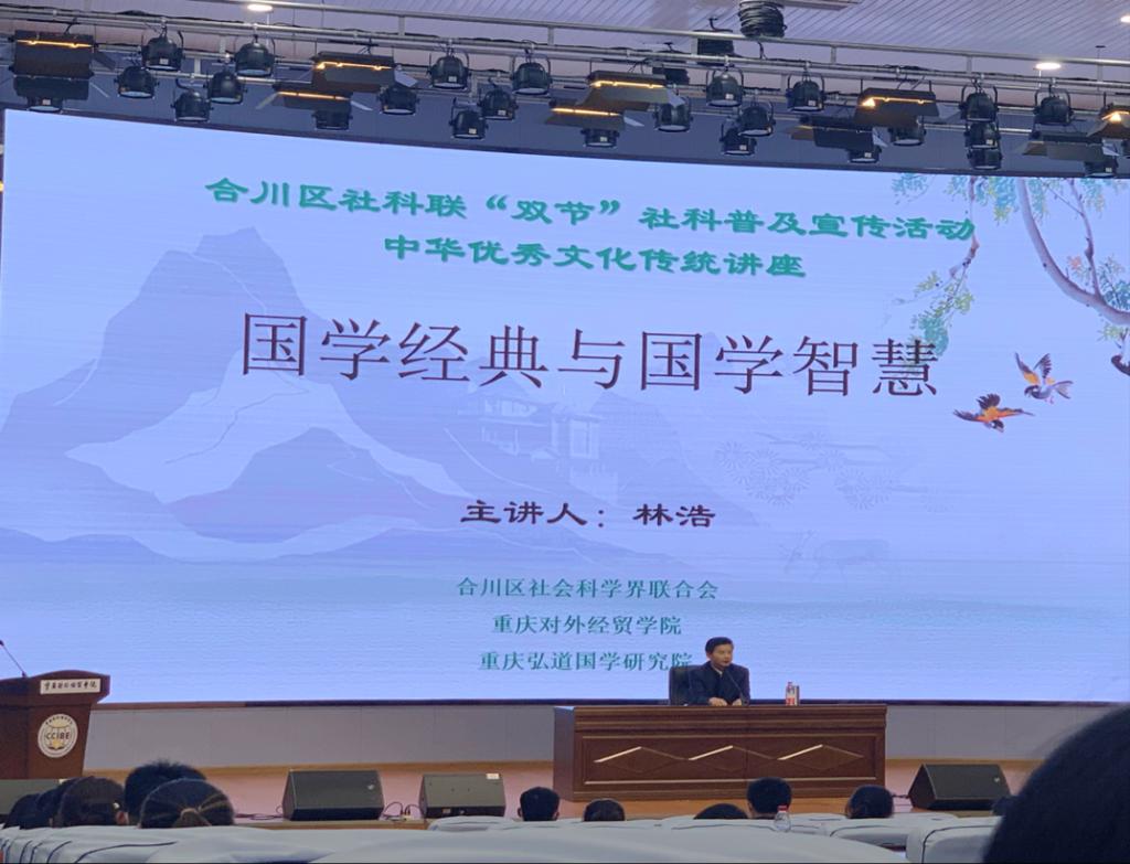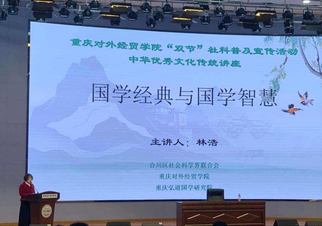 为凸显学院“国学奠基”的办学理念、传承和弘扬中华优秀传统文化,增强大学生的国学素养,让当代大学生充分体会国学智慧的价值与魅力。9428cn太阳集团古天乐9428cn太阳集团古天乐和科研处于3月15日下午在合川校区9101学术报告厅联合举办了“国学经典与国学智慧”讲座。此次讲座特邀请了重庆弘道国学研究院副院长林浩教授为学生们做讲座,重庆弘道国学研究院党支部副书记李红军、重庆弘道国学研究院副院长陶金刚、重庆弘道国学研究院院长助理樊讯一行及我院两百余名大学生参加此次讲座,文创学院副院长陈寿琴副教授主持讲座。