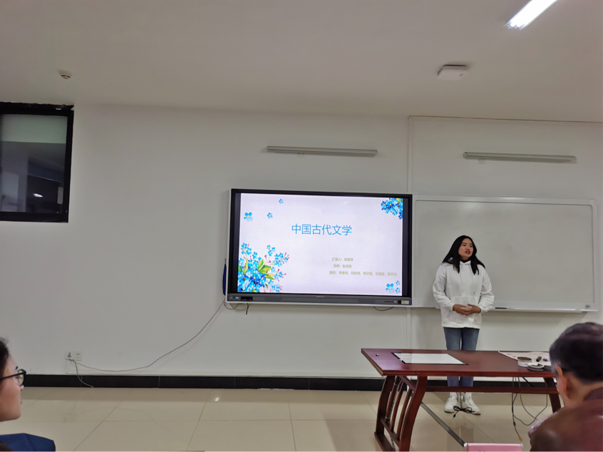 会议伊始,各小组以汇报的形式进行了阶段性的学习总结,本次共有九个小组进行小组汇报。以赵丹妮老师所带的学生小组开始,小组代表进行了对中国古代文学的学术分析、展示了小组的读书笔记、小组论文完成情况以及论文中存在的问题及解决方法。本次汇报以王萌老师所带的学生汇报收尾。