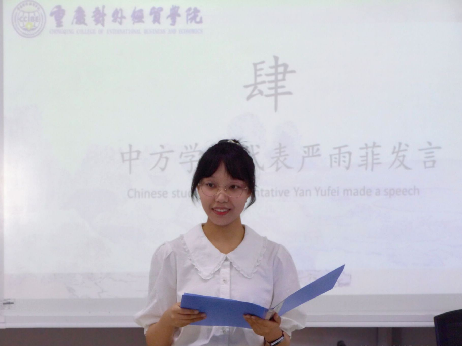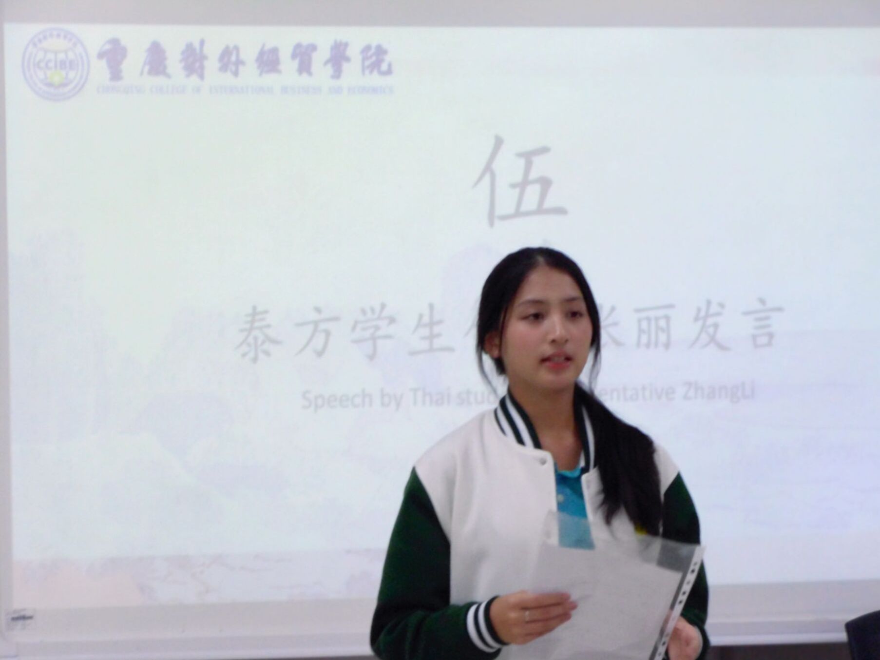 在中泰双方学生代表发言环节,中方学生代表、我院国际交流与合作中心成员严雨菲同学表示我们会以欣赏互鉴之心,当好中泰文化传播使者。中国同学也将热情引导、真诚互助,期待与游学团师生在贸院共筑难忘回忆。泰方学生代表张丽同学以流利的中文诉说了对中华文化的热爱,表达了对贸院生活的憧憬和对此次中国之行的热切期待。