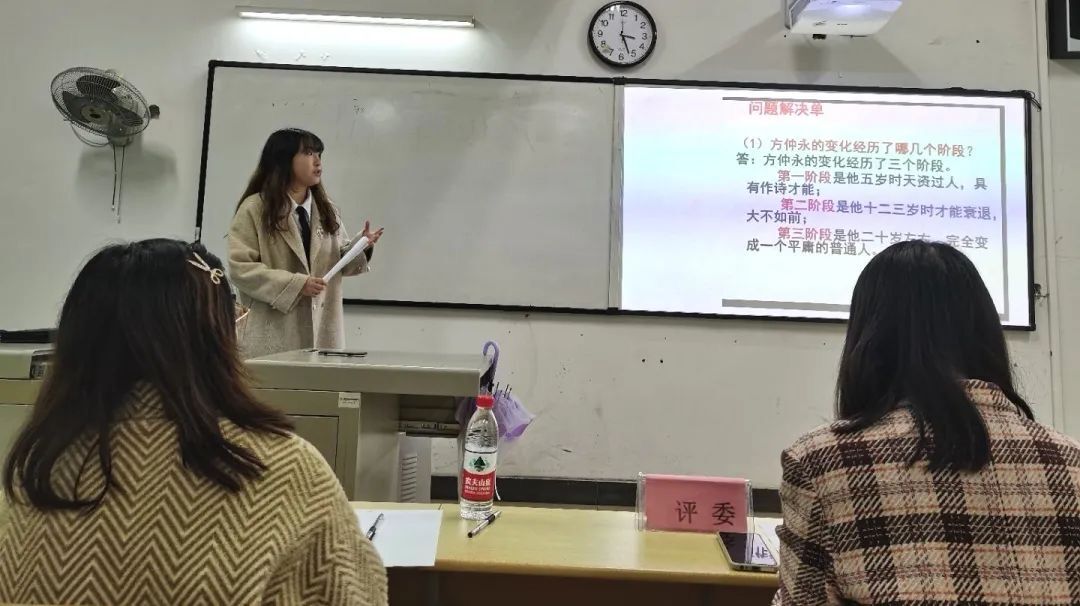 复赛在6211教室进行。由副院长陈寿琴副教授、冯少明副教授、侯仲林副教授、彭品荣副教授、李毅老师五人担任评委。参赛选手按工作人员组织顺序依次上台,续讲课文《伤仲永》,评委老师综合点评并打分,时长5分钟。参赛选手们声情并茂,意气风发,用自己独到的见解和饱满的热情带来了一堂堂生动有趣的古文讲解。经过两个多小时的热烈比拼,本次比赛最终落下帷幕。