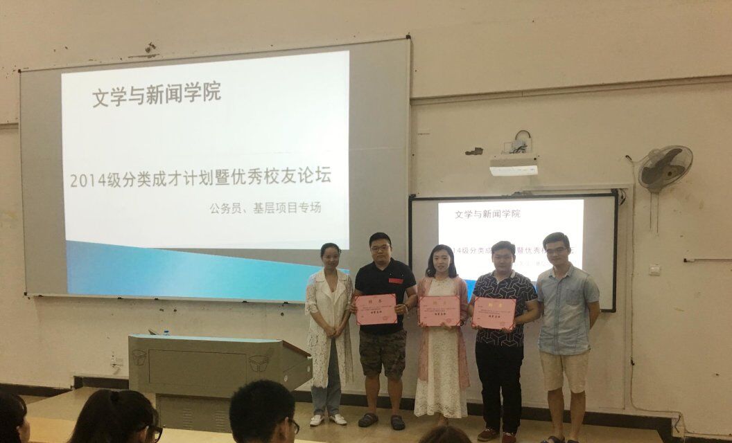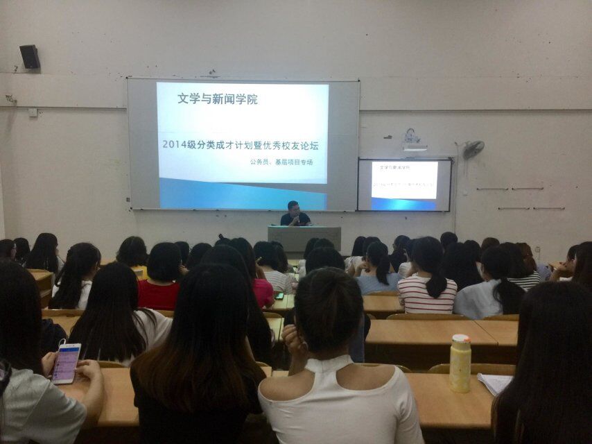 本周日19:00我院在6116召开了2014级本科学生职业规划与就业指导暨优秀校友论坛。参加本次论坛的有团总支书记曾贵老师,辅导员林燕老师、李玲老师以及朋辈导师罗尚维、王晋毓、罗嘉鑫等三位优秀的文新学子。2014、2015级选择了公务员和基层项目就业意向的200多名同学参加了讲坛。