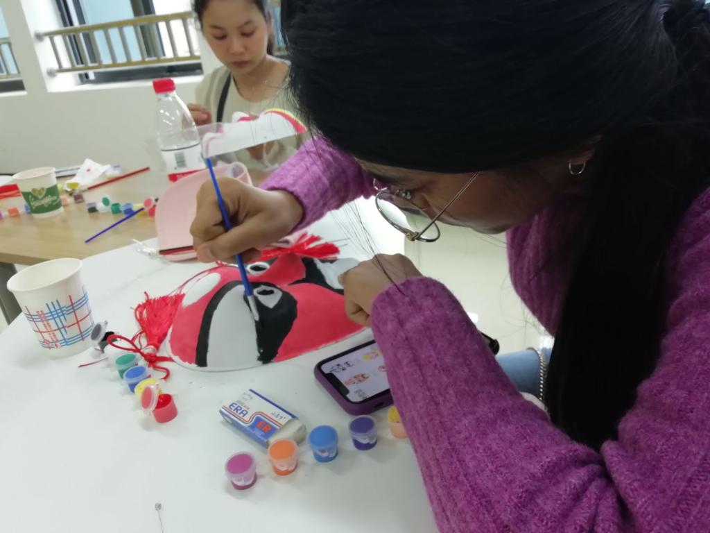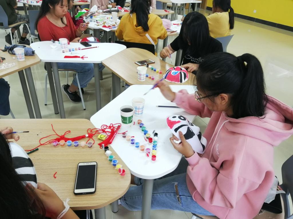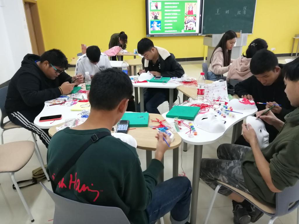 在课堂上,游学生们分为四组,每个人都自己动手制作了中国的传统手工——中国结和脸谱。每个小组有一名志愿者,志愿者们向游学生提供帮助,示范中国结做法。中泰双方师生欢聚一堂,观看了中国结和脸谱的制作过程并互相展示了自己的手工制作成果。