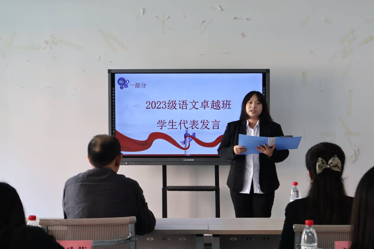 教务处处长曾雪梅发表讲话,她围绕“感谢、感触、感叹”三点,表达了对卓越班的期望和祝福。感谢学院领导和老师们的辛勤付出,感触于同学们的朝气蓬勃和对知识的渴望,感叹教育事业的责任和伟大。