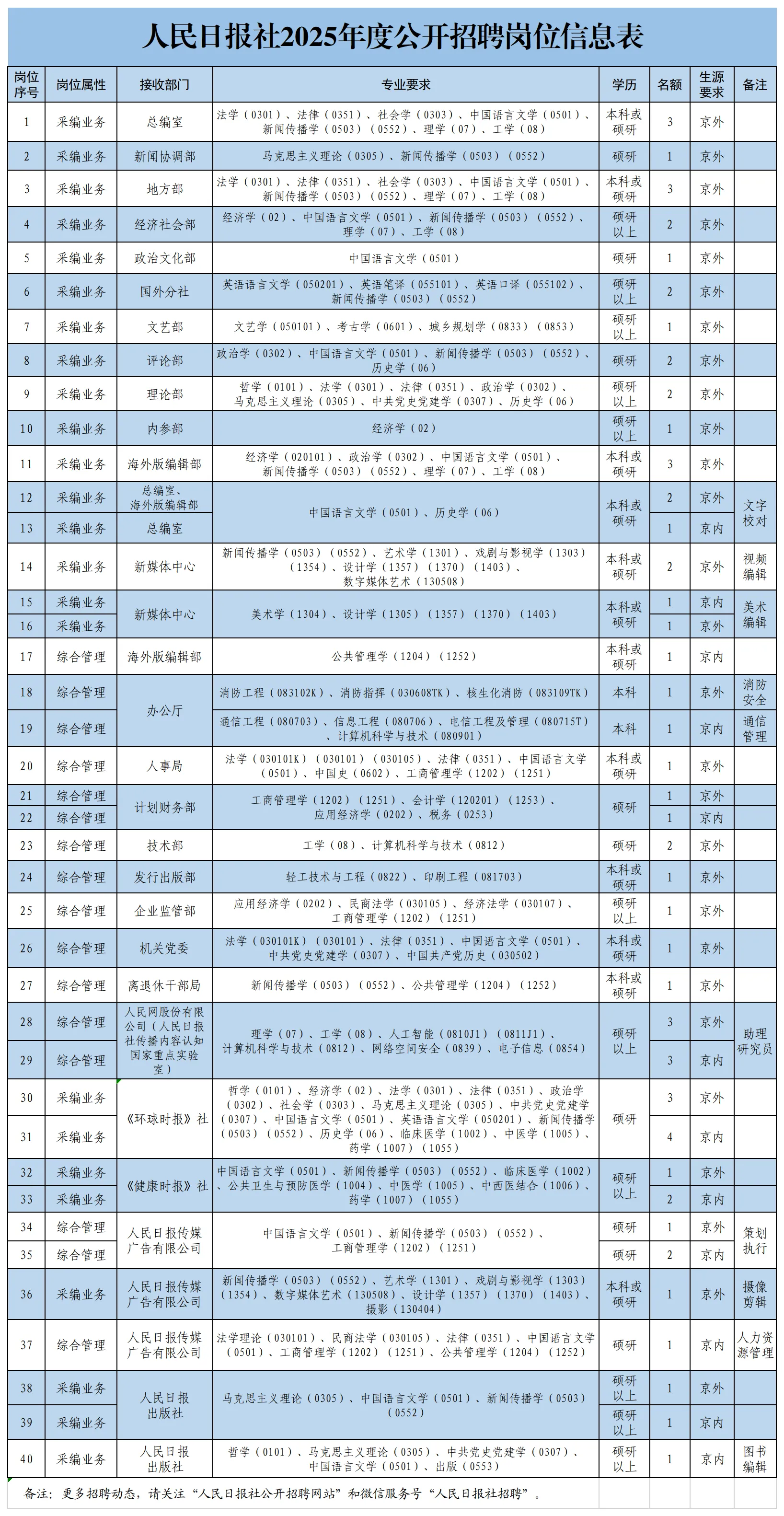 根据事业发展需要,人民日报社2025年度面向国内高校应届毕业生和海外留学人员公开招聘工作人员64名。现将有关事项公告如下。