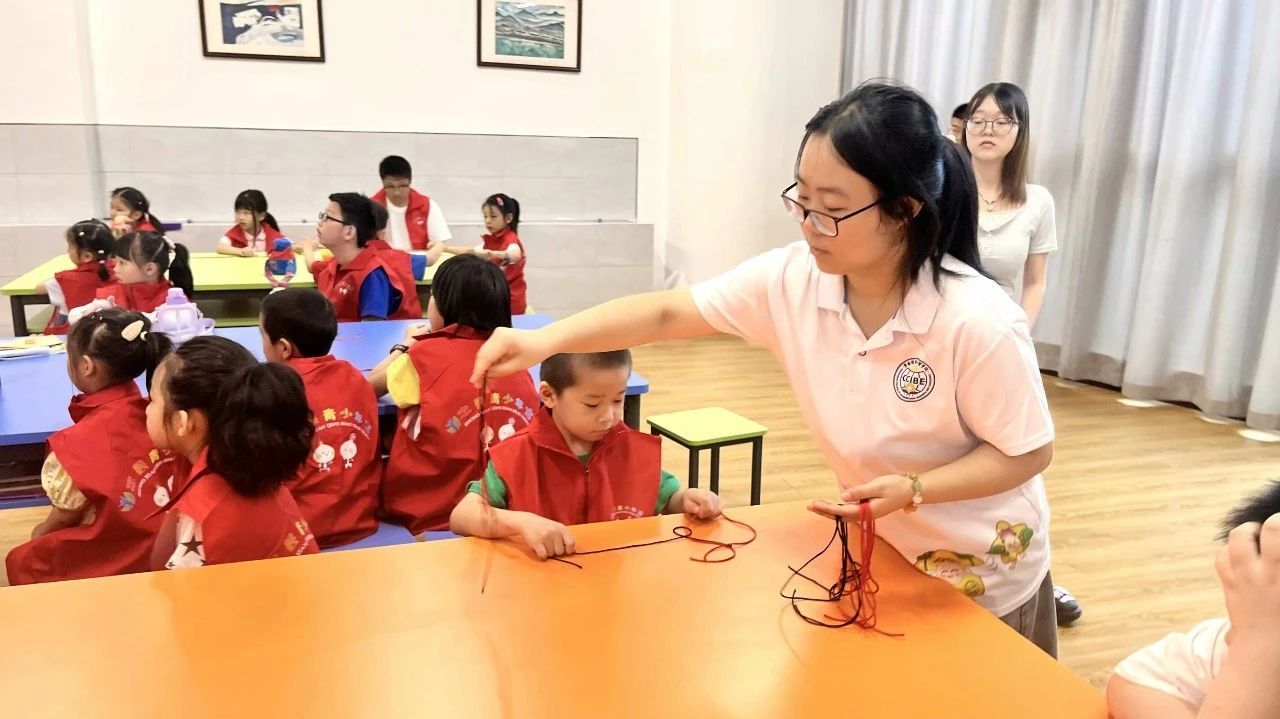 实践团组织开展多元化手工课程,教授同学们编制中国结、形状绘画、红色剪纸等的公益课程,在编制中国结课程中,实践团成员化身小老师,拉起同学们的小手,用一根红丝线经过编制、拉结、装饰三个步骤共同完成手中的中国结。通过中国结的编制及中国结意义的传授,同学们对中国的传统工艺有了更深入的了解,并对手工制作产生极大兴趣。
