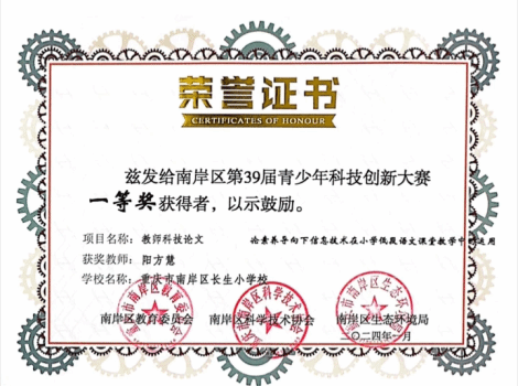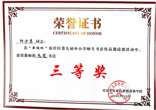 2023年11月,区级“新城杯”第九届中小学师生书法作品邀请赛活动中,获教师组毛笔书法三等奖;2023年12月,市级“川渝地区中小学教师阅读指导优秀案例展评”活动,其教学设计(《做最勇敢的自己》整本书阅读教学设计)获二等奖;2024年1月,区级第39届青少年科技创新大赛,其教师科技论文项目(《论素养导向下信息技术在小学低段语文课堂教学中的运用》)获一等奖;2024年2月,市级第二届小学师生“开口即美”线上大会,获教师组经典诵读三等奖;2024年5月,区级中小学优秀阅读指导课案例(《你看起来好像很好吃》绘本阅读指导课)评选活动一等奖;2025年1月,“公众号”团队在2024-2025学年度上期荣获“校长提名奖”;2025年1月,“开口即美”实践研究成果(《小熊过桥》)获市级一等奖。
