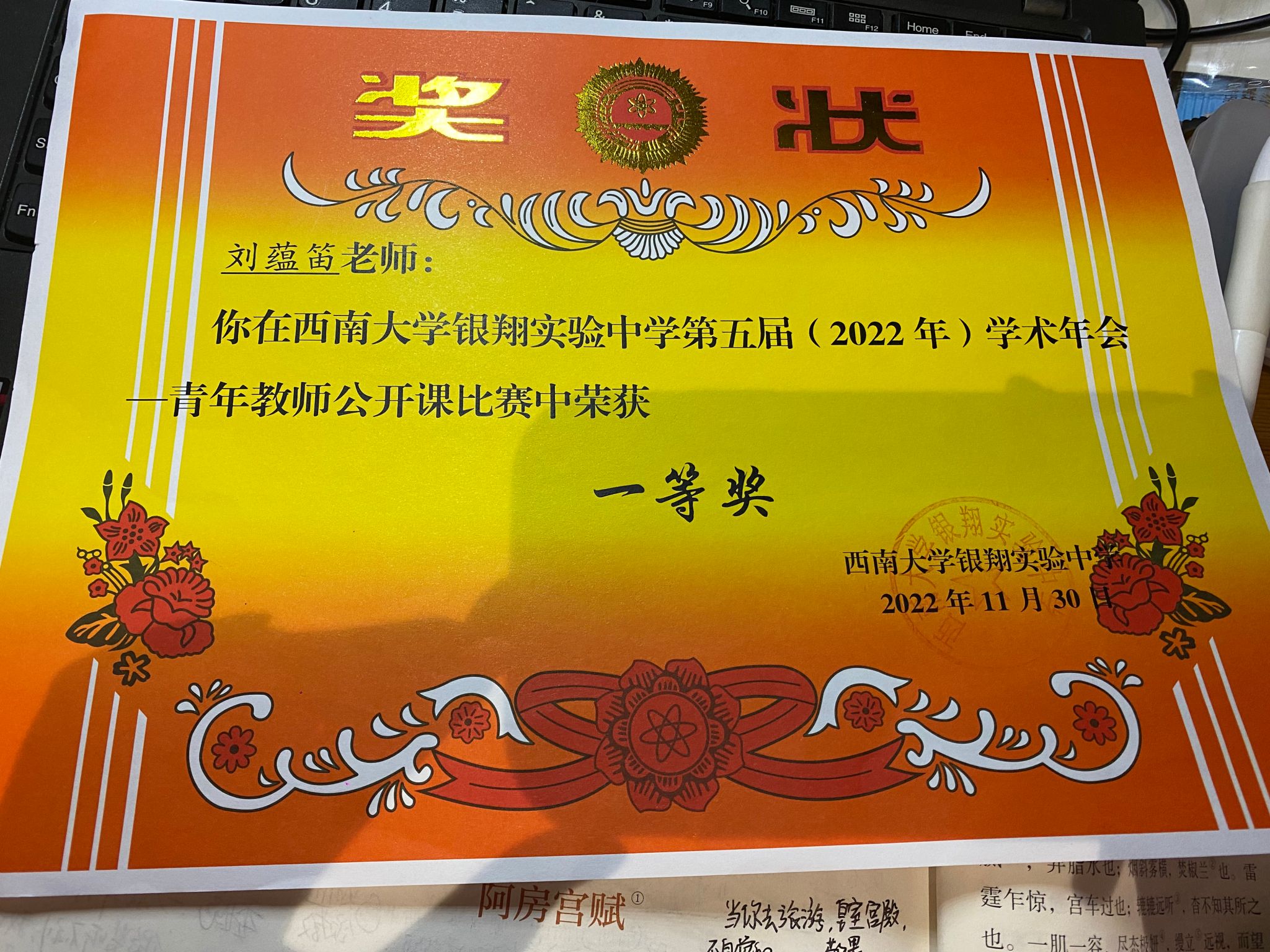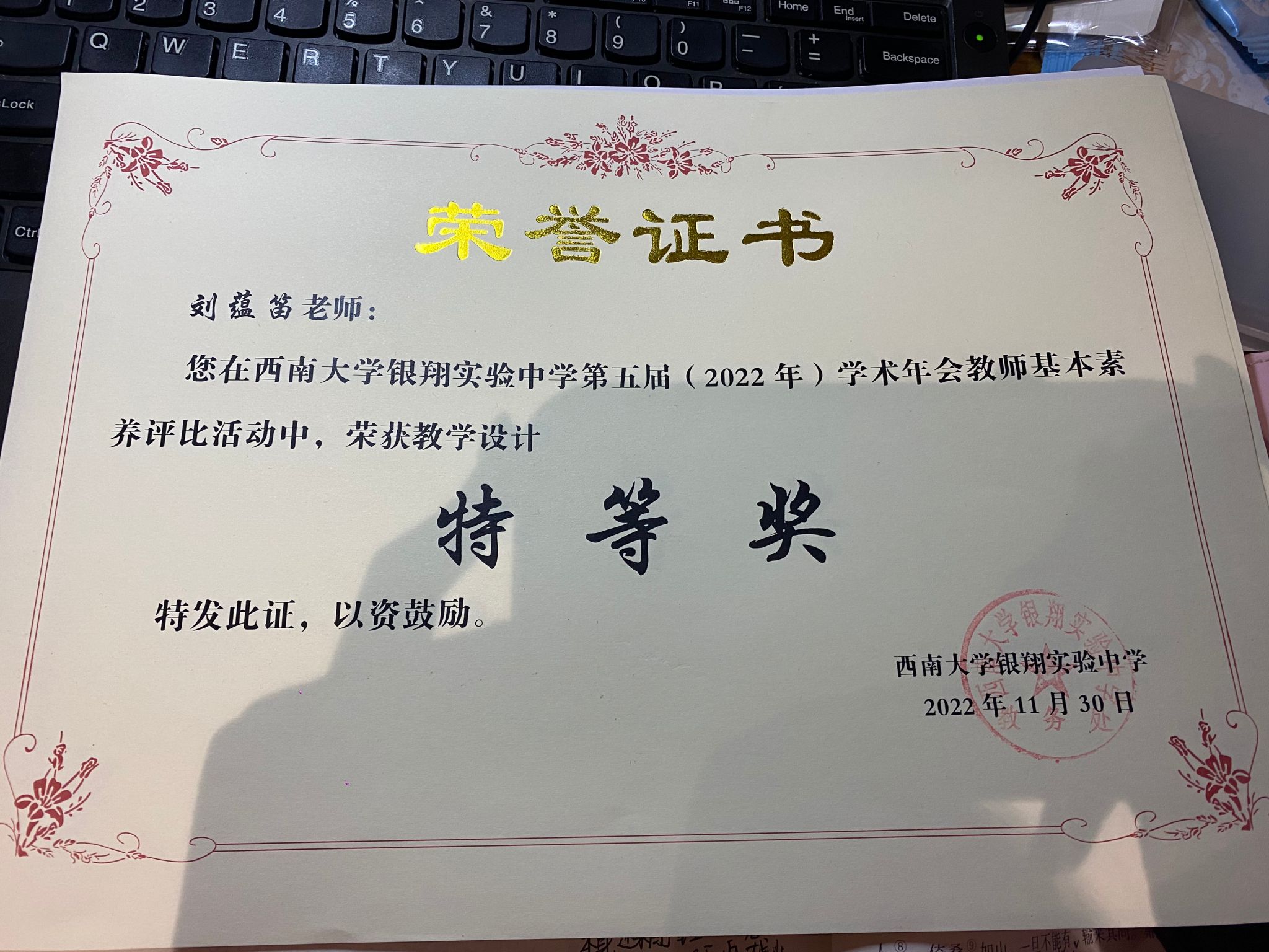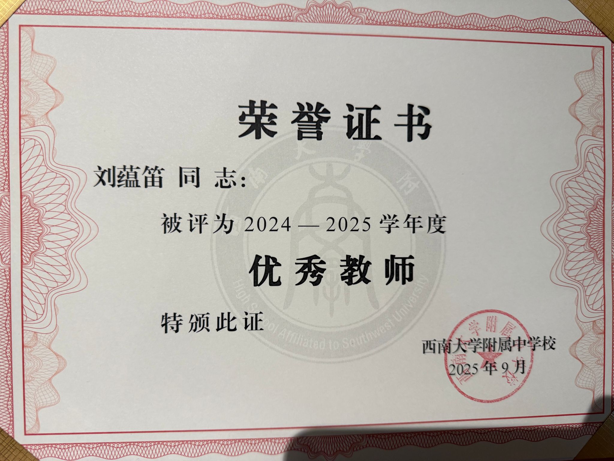 图为刘蕴笛老师被评为西南大学附属中学优秀教师